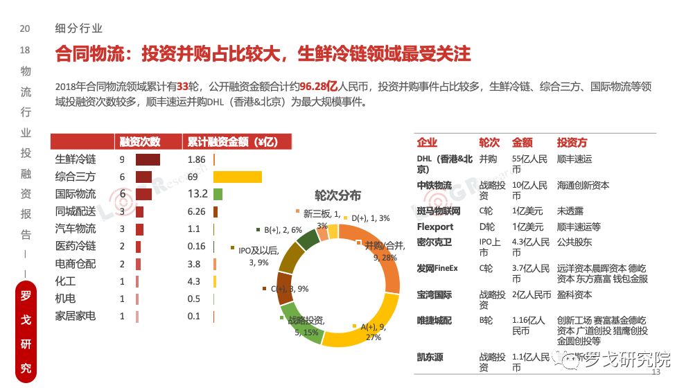 2018年合同物流领域累计有33轮,公开融资金额合计约96.28亿人民币,投资并购事件占比较多,生鲜冷链、综合三方、国际物流等领域投融资次数较多,顺丰速运并购DHL(香港&北京)为最大规模事件。